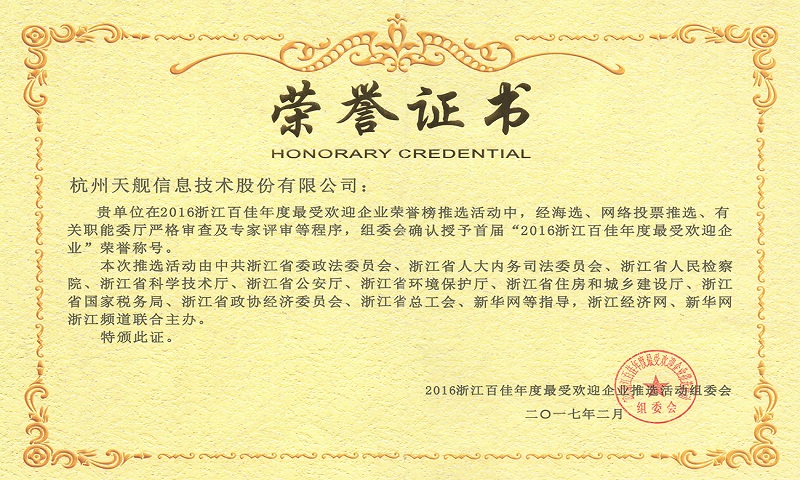 天舰股份荣获“2016浙江百佳年度最受欢迎企业”